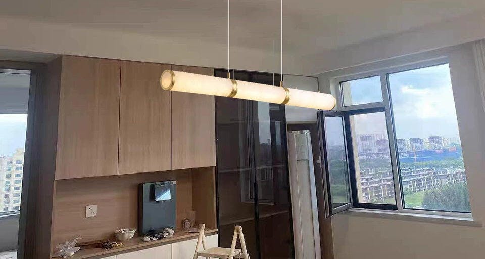 Sleek yet soulful, the Alabaster Beam Pendant Light brings together natural beauty and modern clarity. A long beam of translucent alabaster appears to float mid-air, suspended by minimalist cords and framed with elegant metal caps. The warm light glows from within, highlighting each stone’s delicate veining like a brushstroke.