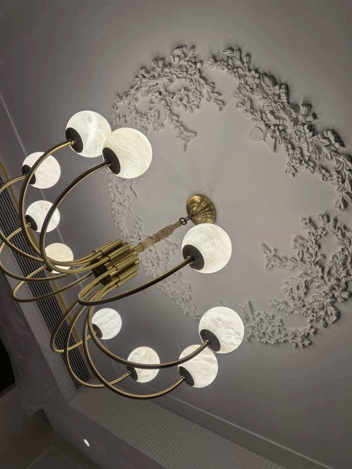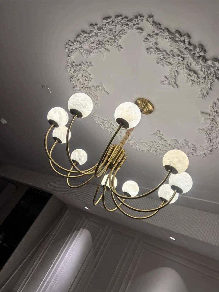 A poetic take on classic grandeur, the Aurelian Alabaster Globe Chandelier marries the warmth of brushed brass with the luminous serenity of alabaster. Its sculptural arms branch outward with elegant poise, each ending in a glowing alabaster sphere like soft celestial orbs suspended in air.