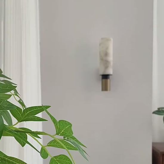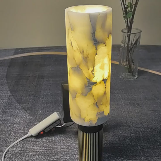 The Marlo Alabaster Wall Lamp is a refined statement of elegance and modern luxury. Featuring a natural alabaster cylindrical shade, it softly diffuses light while showcasing unique veining patterns, ensuring that each piece is one of a kind. The shade is paired with a vertically grooved brass base, combining warm metallic tones with the organic translucence of stone. Perfect for hallways, living rooms, or bedside lighting, this wall lamp merges timeless materials with contemporary design, creating a sophisticated and inviting atmosphere.
