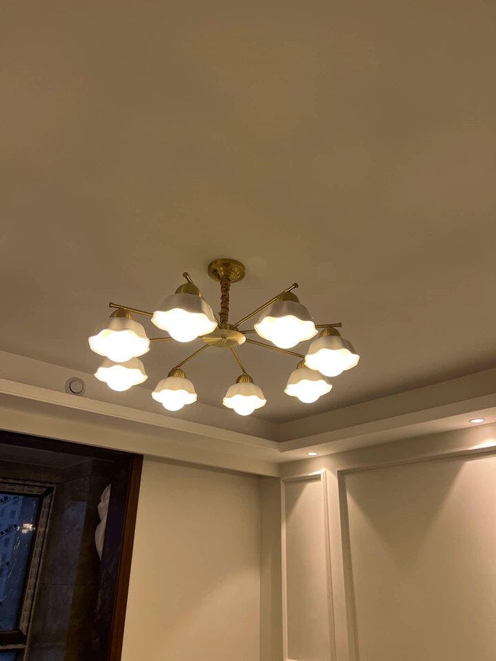 This Modern Flower Chandelier features a gold metal frame paired with white ceramic petal-shaped shades, creating a sophisticated and elegant design. The combination of luxurious materials and delicate forms adds a refined touch to any contemporary space, making it a striking centerpiece that blends artistry with modern style.
