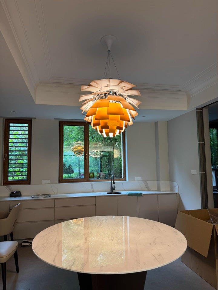 The larger 72 cm pine cone shines softly above our dining table and adds sculptural flair