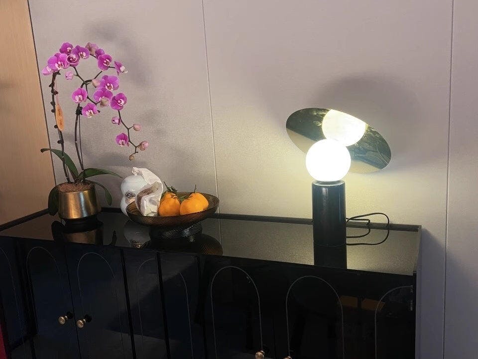 Experience a captivating interplay of light and shadow with our Bola Style Disc Table Lamp. This is more than a lamp; it's a piece of sculptural art designed to transform your space. A luminous opal glass globe appears to float effortlessly in front of a mirror-polished disc, creating a magical reflection that doubles the visual intrigue.