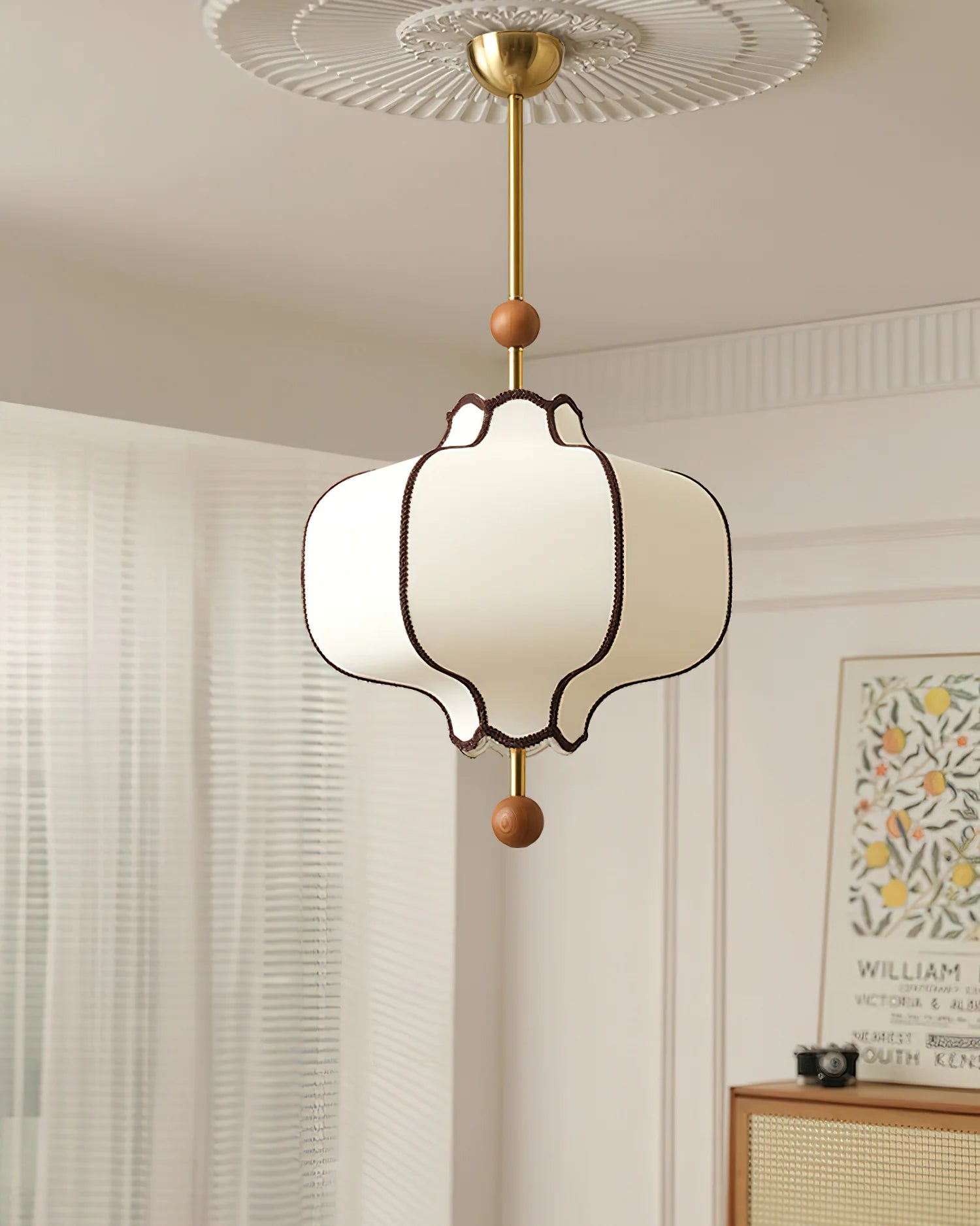 Its fabric shade features a refined lantern silhouette outlined with delicate trim, creating a gentle play of light and shadow. The slender metal rod paired with wooden accents adds natural warmth while maintaining a modern aesthetic.