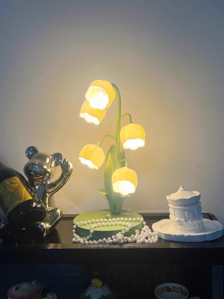 The sculpted glass petals glow softly—this lamp brings a charming vintage flower vibe to my reading nook.
