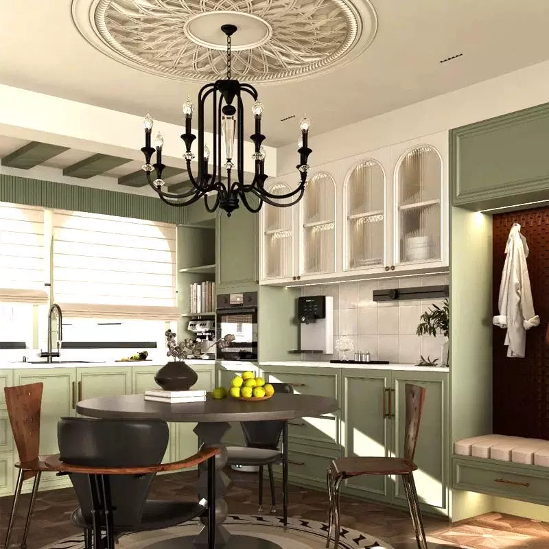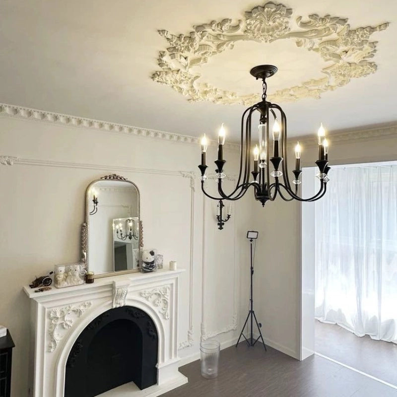 Crystal accents are delicately positioned to reflect light with subtle clarity, adding depth and brilliance against the rich noir finish. The candle-style illumination evokes traditional European chandeliers, creating a warm and sophisticated ambiance suited for dining rooms, formal living areas, grand foyers, or statement bedrooms.