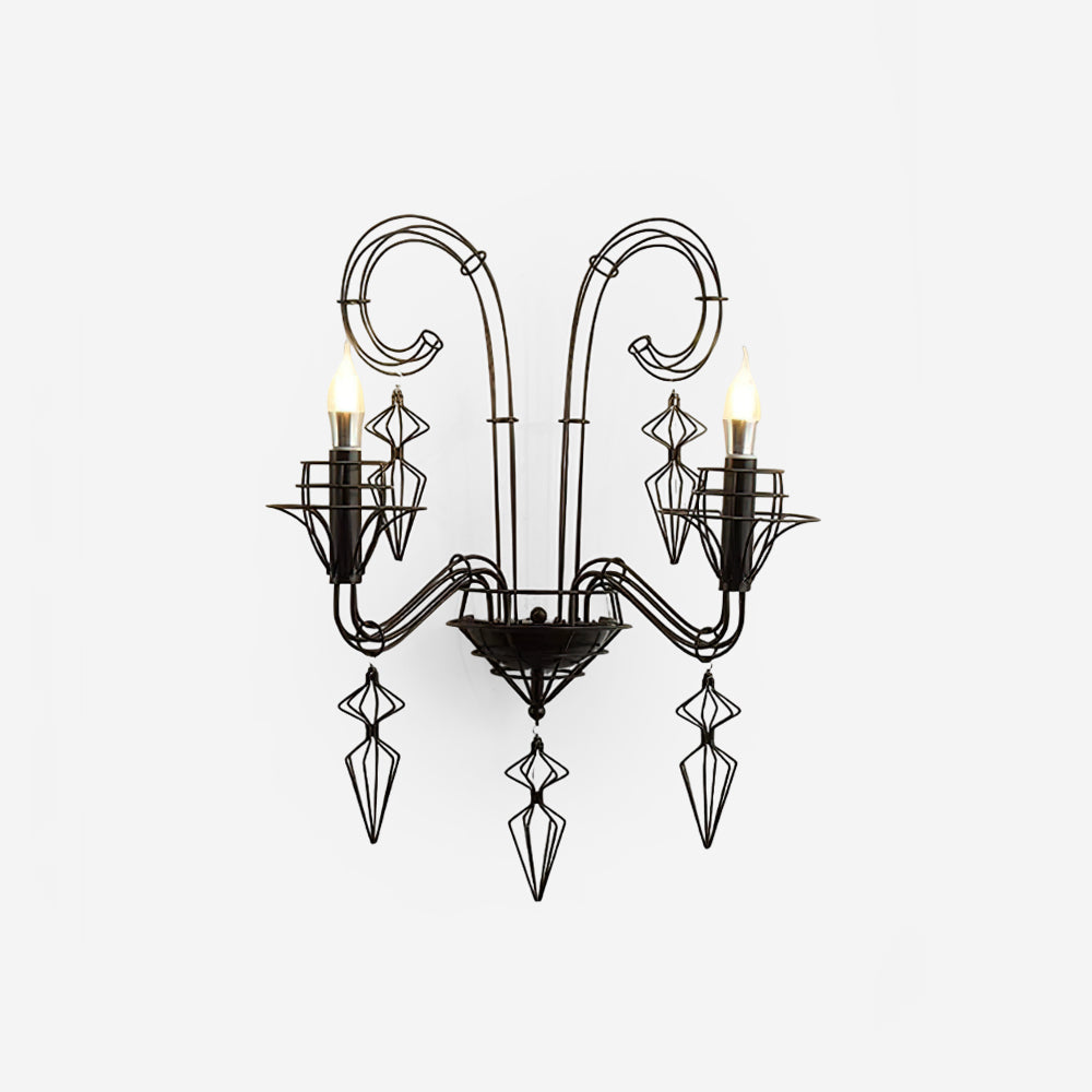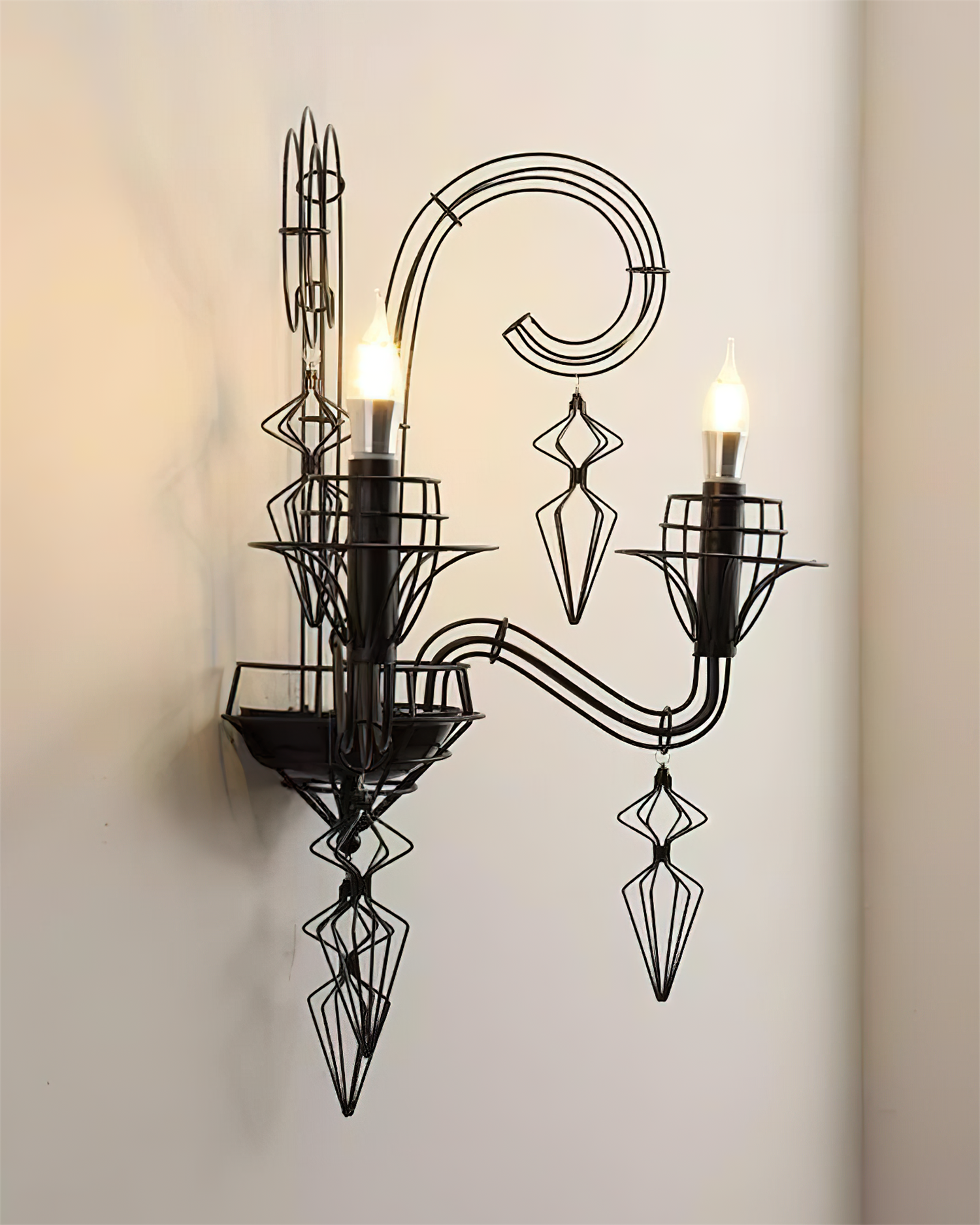 The Baroque Vintage Iron Wall Lamp brings a dramatic yet refined touch to any interior. Crafted from sculpted black iron, it features curling arms, candle-style sockets, and geometric pendants paired with faux candle bulbs. Inspired by classical European design, it balances ornate detailing with a sense of lightness, avoiding the heaviness of traditional fixtures. When illuminated, its openwork structure casts captivating shadows, creating an elegant, nostalgic atmosphere. Perfect for hallways, staircases, or vintage-inspired living spaces, this wall lamp serves as both a functional light source and a striking decorative accent.