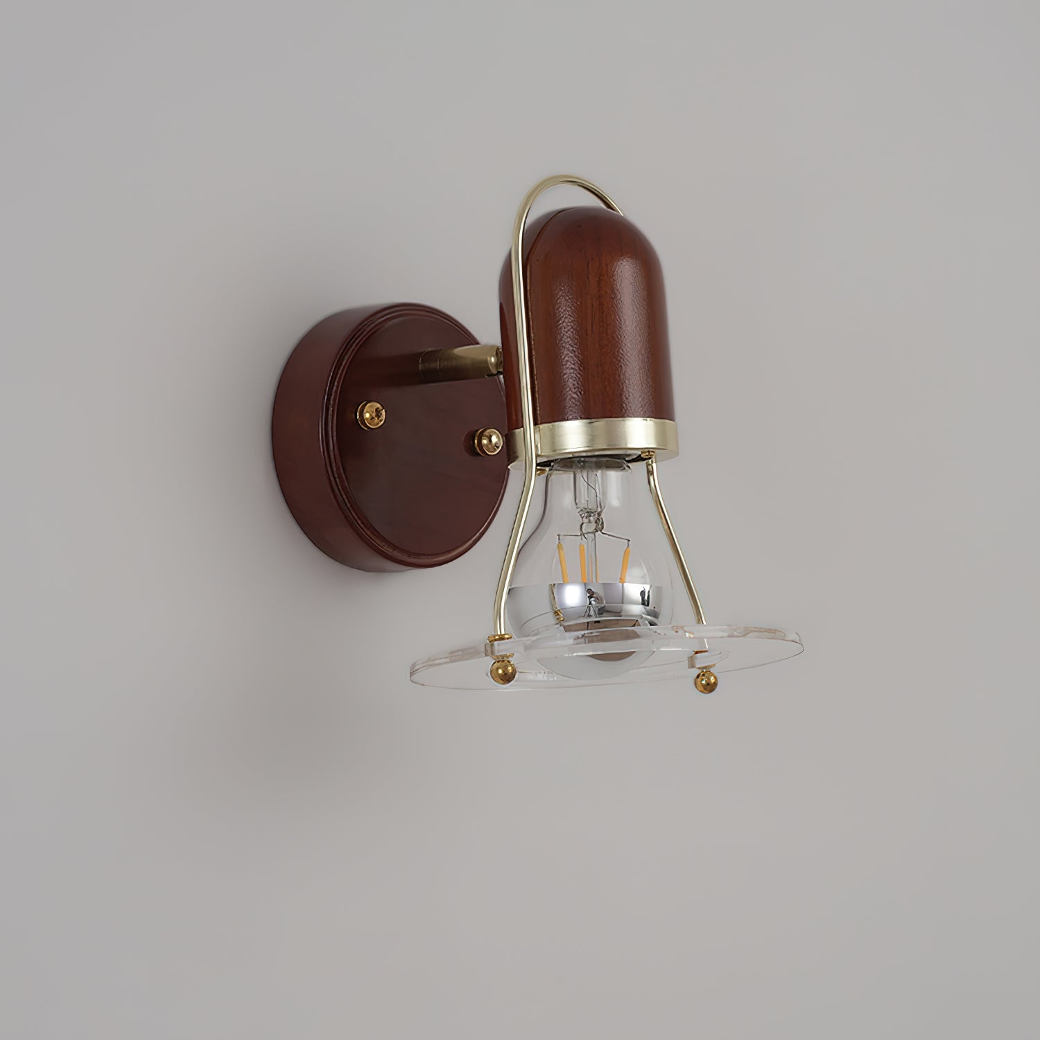 The Halle Wall Lamp features a deep wood-toned circular base paired with a gold metal frame and a transparent acrylic ring shade, showcasing an exposed bulb. Its design harmonizes natural materials with industrial elements, perfectly suited for vintage or loft interiors. This lamp creates a warm, refined ambiance while serving as both a source of light and an elegant decorative piece.