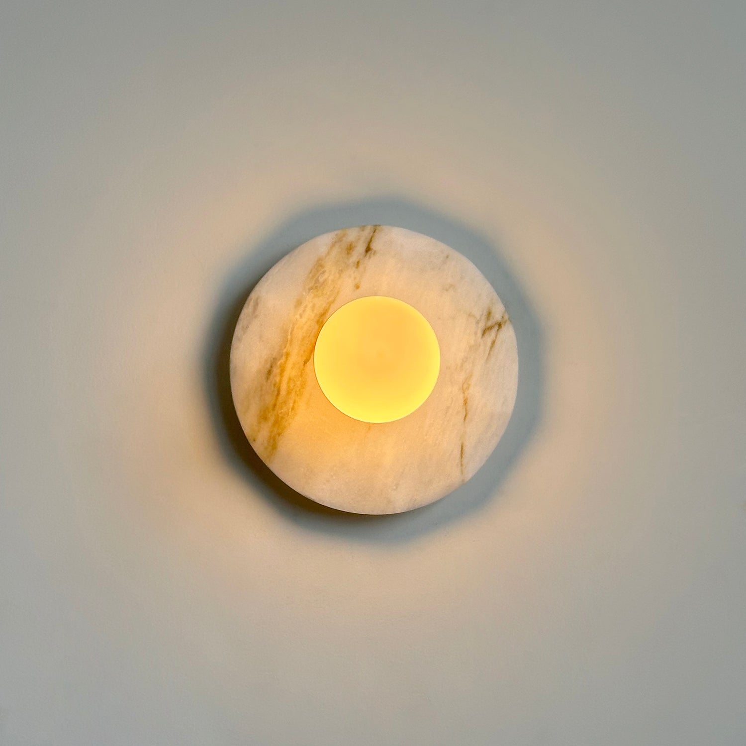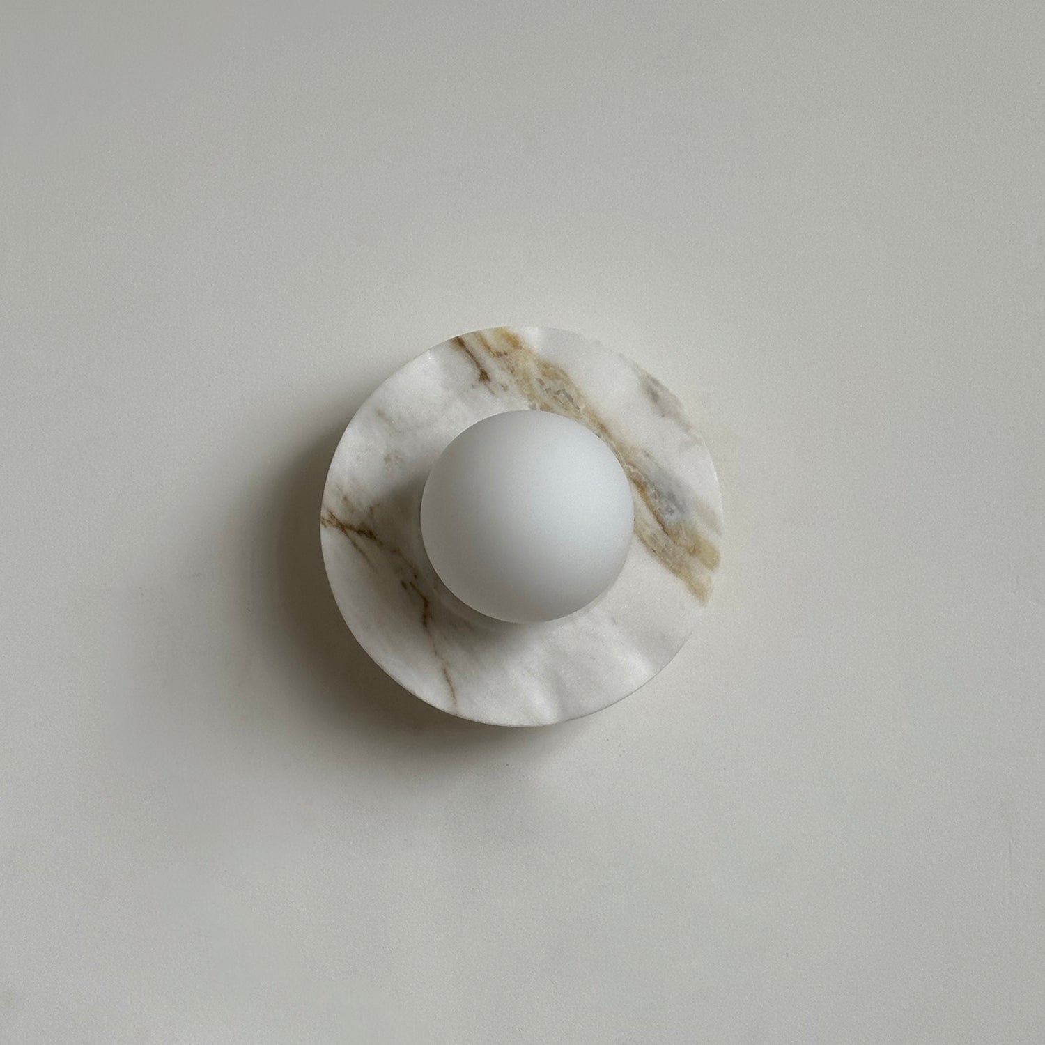 The Meza Marble Wall Lamp is a timeless blend of minimalism and elegance. Featuring a smooth white marble round base with naturally unique veining, it is paired with a central frosted glass globe that casts a soft, ambient glow. The natural texture of the stone contrasts beautifully with the clean, spherical form of the shade, creating a refined balance of organic and modern elements. Perfect for wabi-sabi, minimalist, or contemporary interiors, this wall lamp provides both decorative charm and functional lighting, bringing serenity and sophistication to any space.