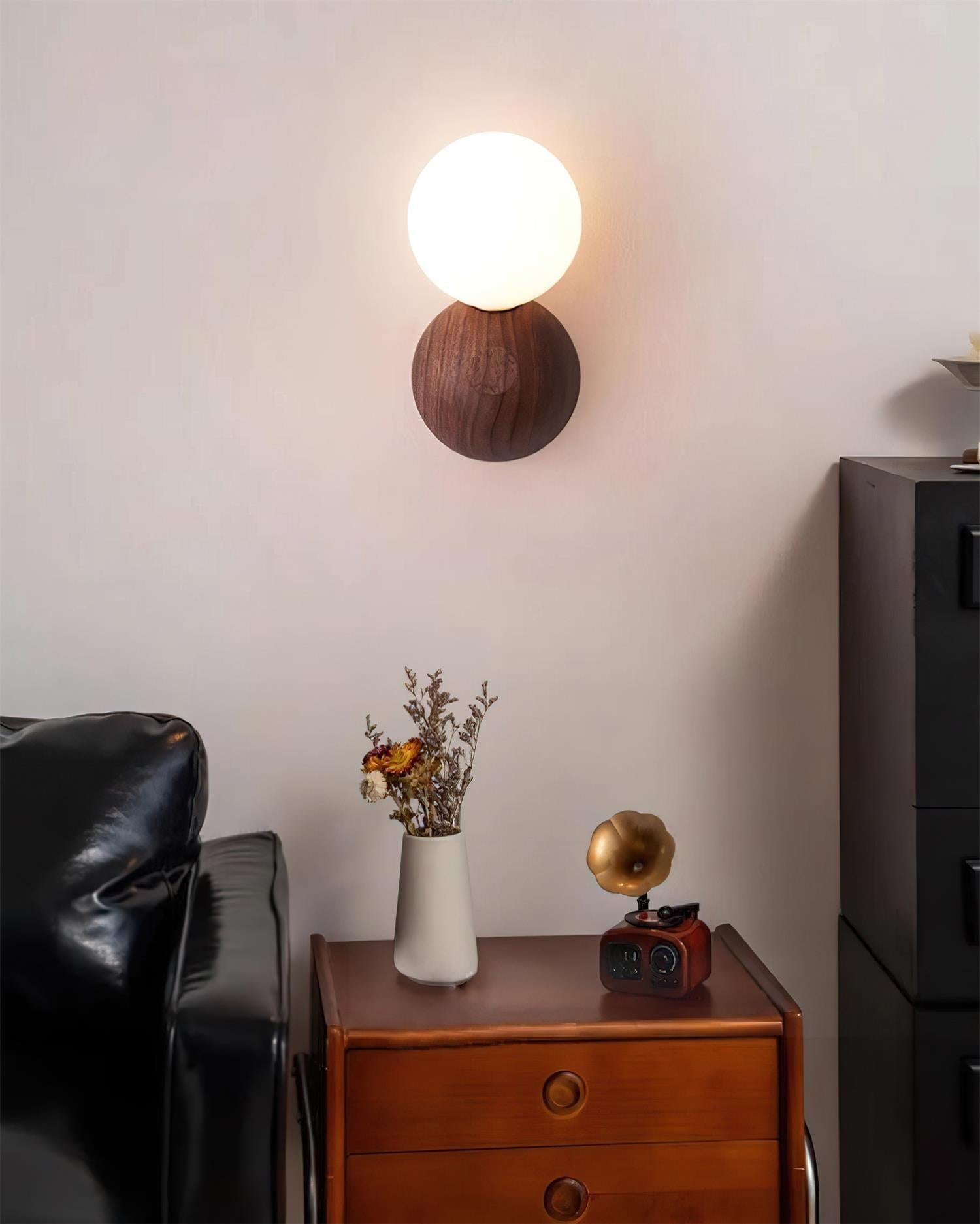 The Ringo Wall Lamp combines a wooden circular base with a white spherical shade in a streamlined design. Its natural wood warmth blends seamlessly with the soft glow of the globe, making it ideal for Japanese, wabi-sabi, and modern minimalist interiors. This piece brings a tranquil, understated elegance while serving both decorative and practical lighting purposes.