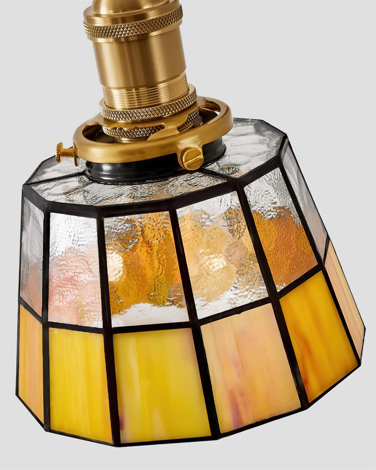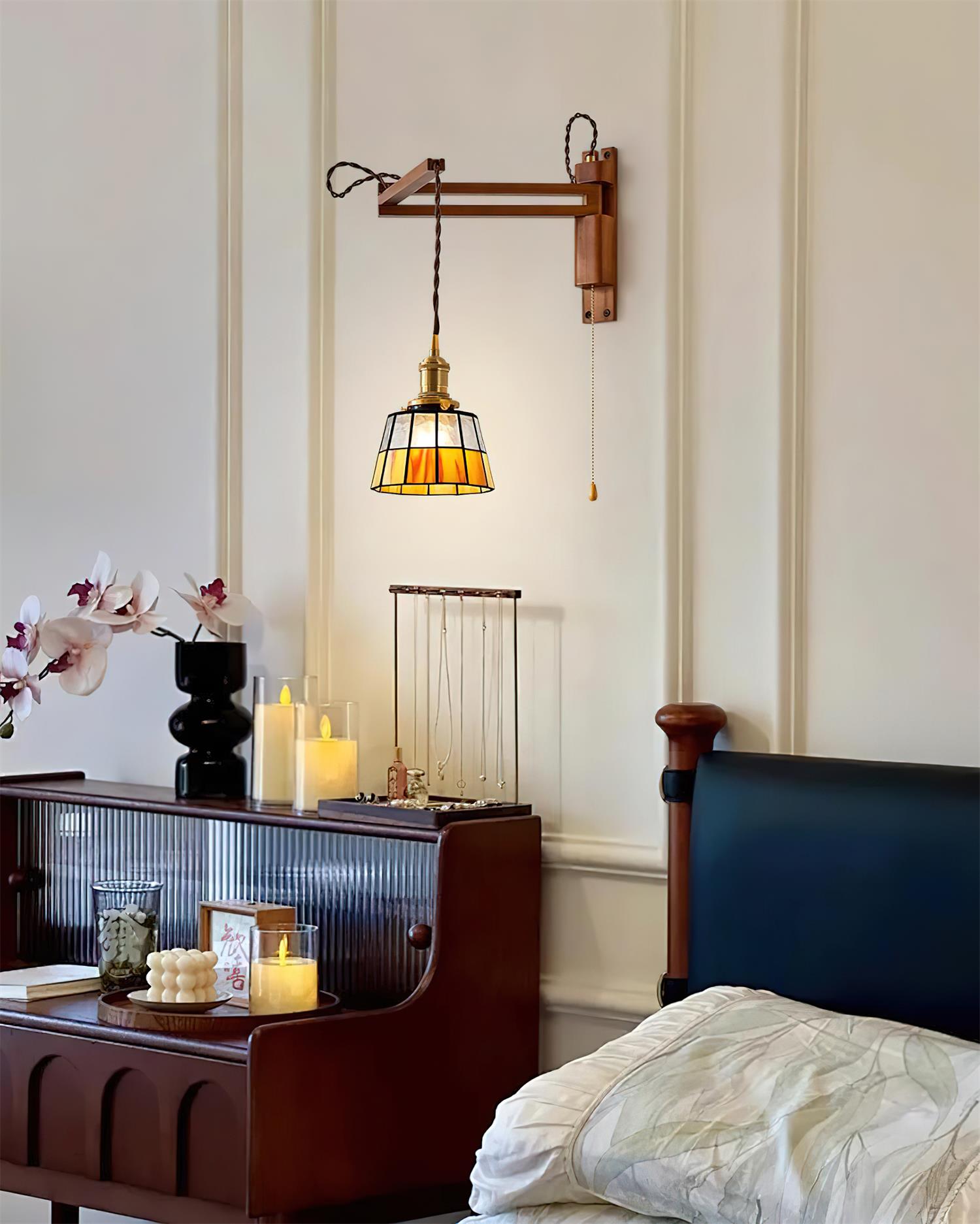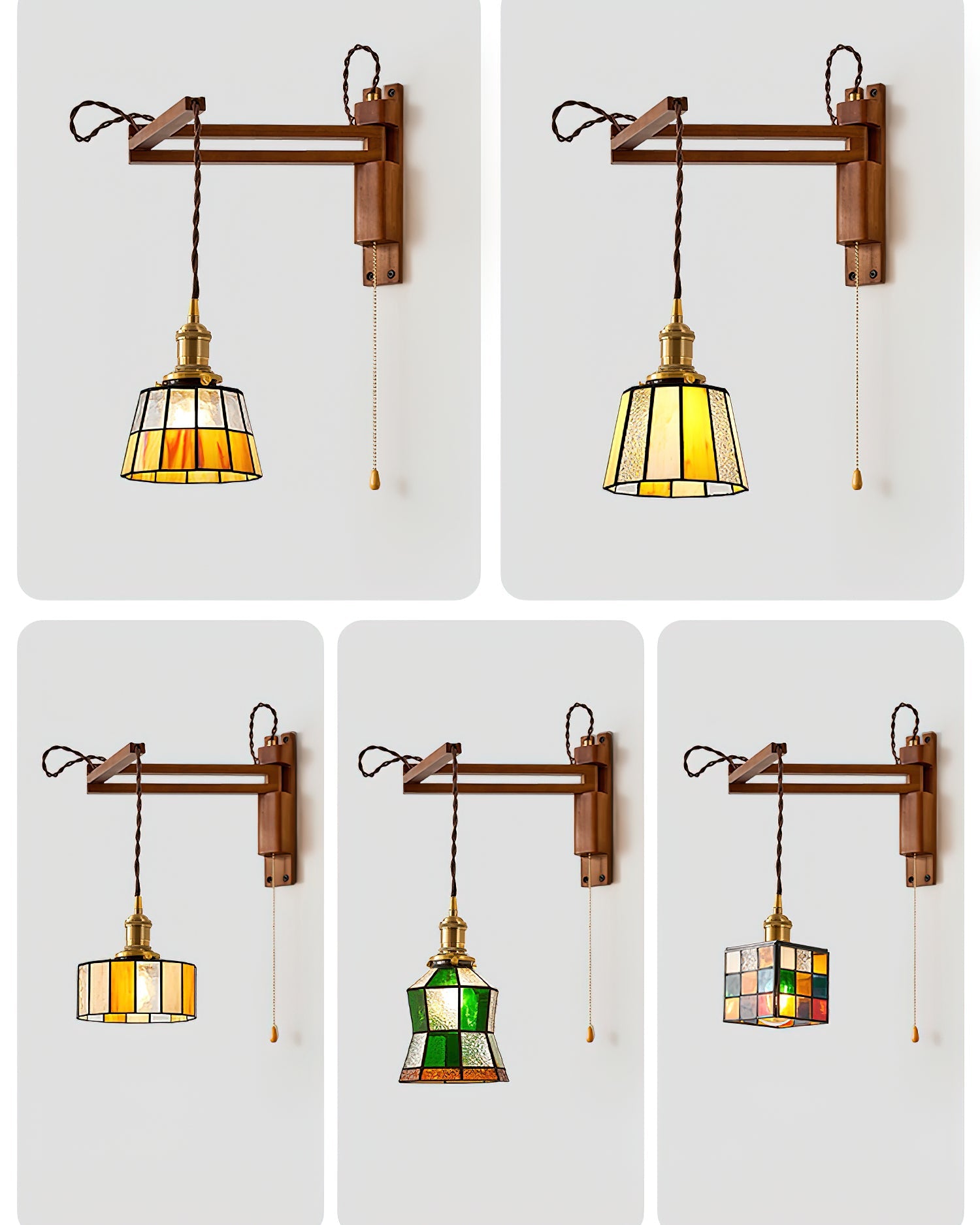 The Vintage Stained Glass Wall Lamp pairs a walnut-finished wooden frame with golden metal details and a colorful stained glass shade. Available in multiple unique designs, including mosaic patterns and cube-shaped styles, each lamp creates a warm and nostalgic glow. Blending timeless craftsmanship with artistic character, this wall lamp is ideal for vintage and rustic interiors, serving as both functional lighting and a decorative statement.