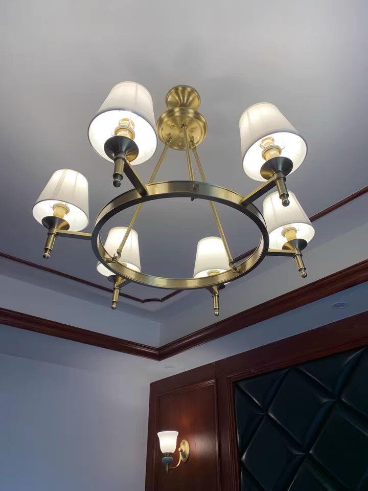 Straal tijdloze elegantie uit met de Classic European Fabric Chandelier. Deze meerarmige lamp heeft een goudkleurig metalen frame in combinatie met zachtbeige stoffen lampenkappen, die warm, sfeervol licht uitstralen. Het klassieke silhouet en de touwvormige ophanging roepen een gevoel van vintage charme op, perfect voor traditionele woonkamers, eetkamers of verfijnde interieurs geïnspireerd op Europese of Amerikaanse landelijke stijlen. Meer dan een lichtbron, het is een uiting van gratie en nostalgie.