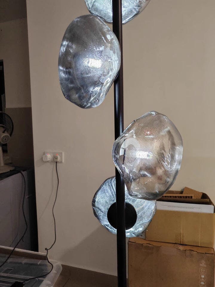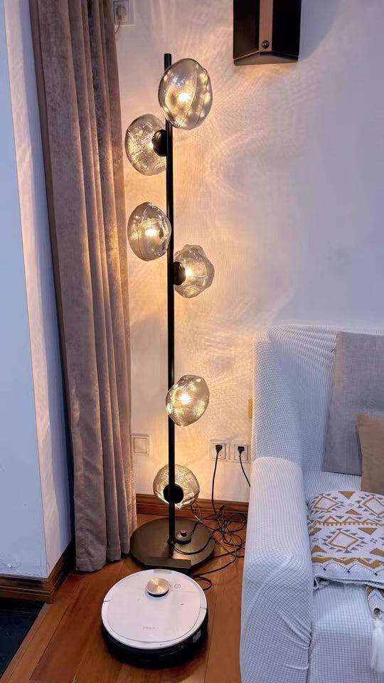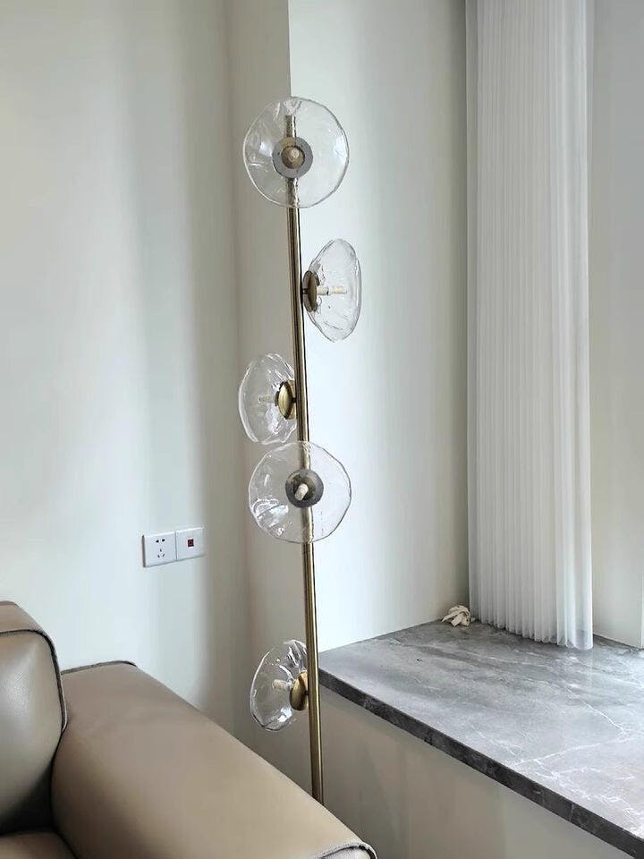 De Glass Petals vloerlamp is een adembenemende combinatie van elegantie en modern design, met glazen bloemblaadjes in de vorm van delicate, bolvormige glazen bollen. Deze unieke, op bloemblaadjes lijkende bollen creëren een zacht, betoverend lichteffect en voegen een gevoel van luxe en verfijning toe aan elke kamer. De vloeiende en lichte vormgeving contrasteert prachtig met de stevige, gepolijste metalen voet, wat zorgt voor zowel stabiliteit als visuele aantrekkingskracht. Ideaal voor woonkamers, slaapkamers of elke ruimte die vraagt ​​om een ​​opvallend middelpunt, deze lamp is een echt statement piece.