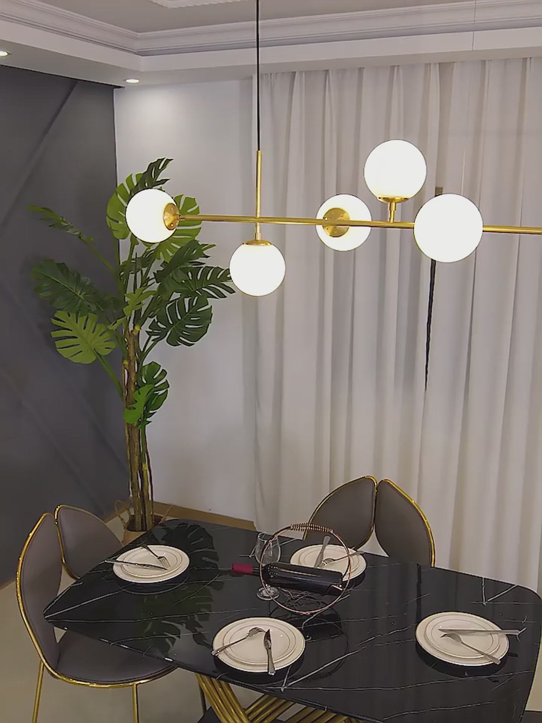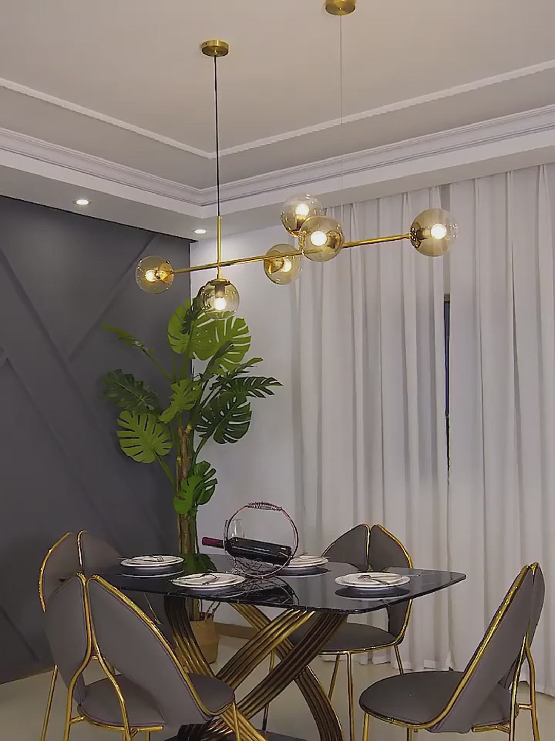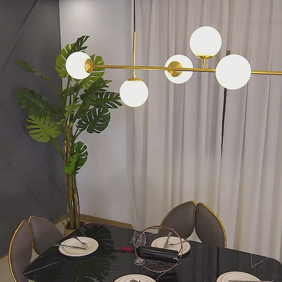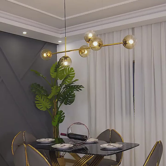 De sculpturale en tegelijk subtiele Orb-kroonluchter herdefinieert moderne verlichting met zijn strakke geometrie en stralende helderheid. Een goudkleurige rug verankert een constellatie van heldere glazen bollen, die elk een gloeiende lamp onthullen.