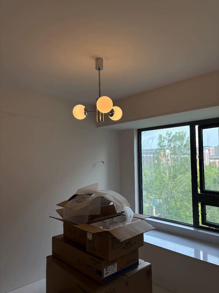 De moderne 3D Globe-kroonluchter heeft strakke metalen lijnen die elegant witte bolvormige lampenkappen ondersteunen. Het verfijnde ontwerp voegt een vleugje verfijning en moderne elegantie toe, waardoor het een ideaal middelpunt is voor stijlvolle, moderne ruimtes.