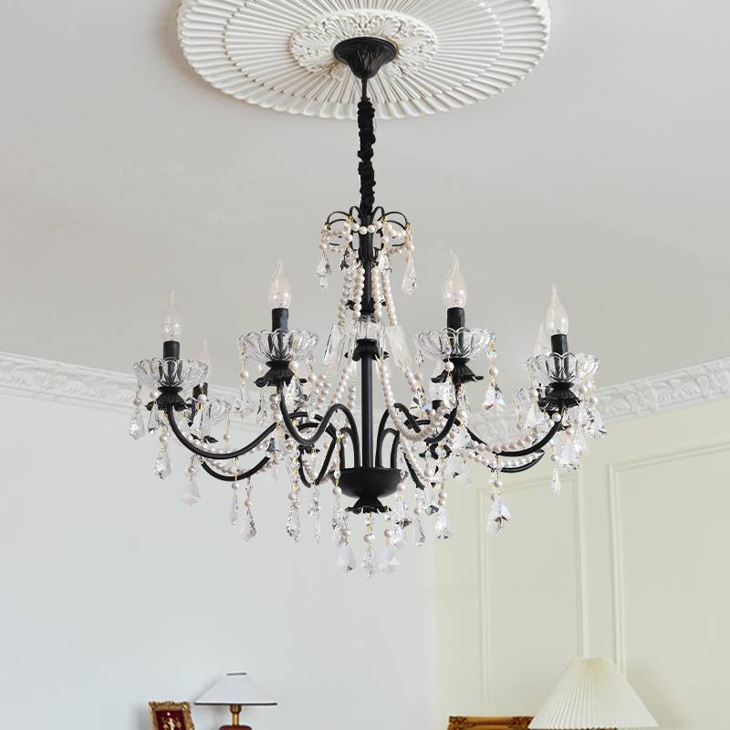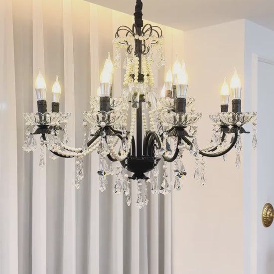 Inspired by the timeless elegance of French palace interiors, the Versailles Classic Black Crystal Chandelier captures the refined grandeur of classical design. A gracefully sculpted black frame supports delicately curved arms, each adorned with cascading crystal drops and pearl-like bead chains. The contrast between the deep black structure and the sparkling crystals creates a sense of drama balanced by elegance. When illuminated, the chandelier casts a warm, luminous glow, evoking the atmosphere of historic salons and formal reception rooms. Designed to elevate dining rooms, living spaces, bedrooms, and grand entryways, this chandelier brings enduring sophistication and old-world charm into both traditional and transitional interiors.